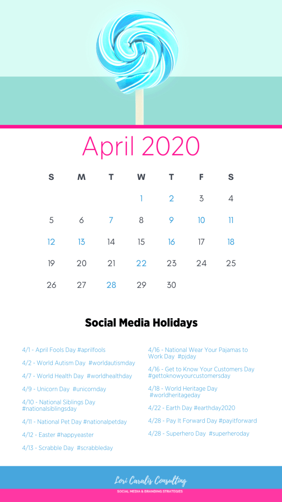 Below is the social media holiday calendar for April 2020. If you don’t want to wait each month to see the calendar, you can download the entire 2020 Social Media Holiday Calendar for free here.