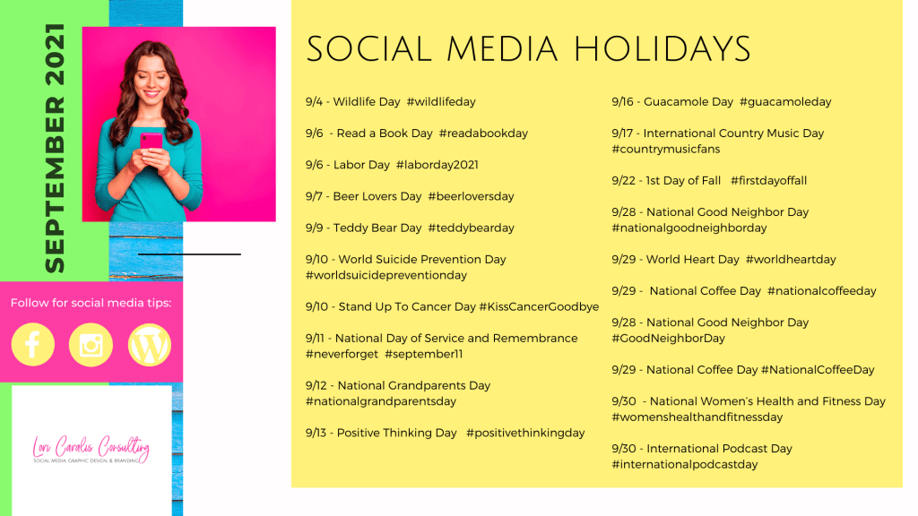 September is here and it’s time to get back to the office and back to school. Do you need some easy content ideas this month as you get back to your regular schedule? I’ve got you covered with my list of September social media holidays, I’ve even included a hashtag to use with each one!
