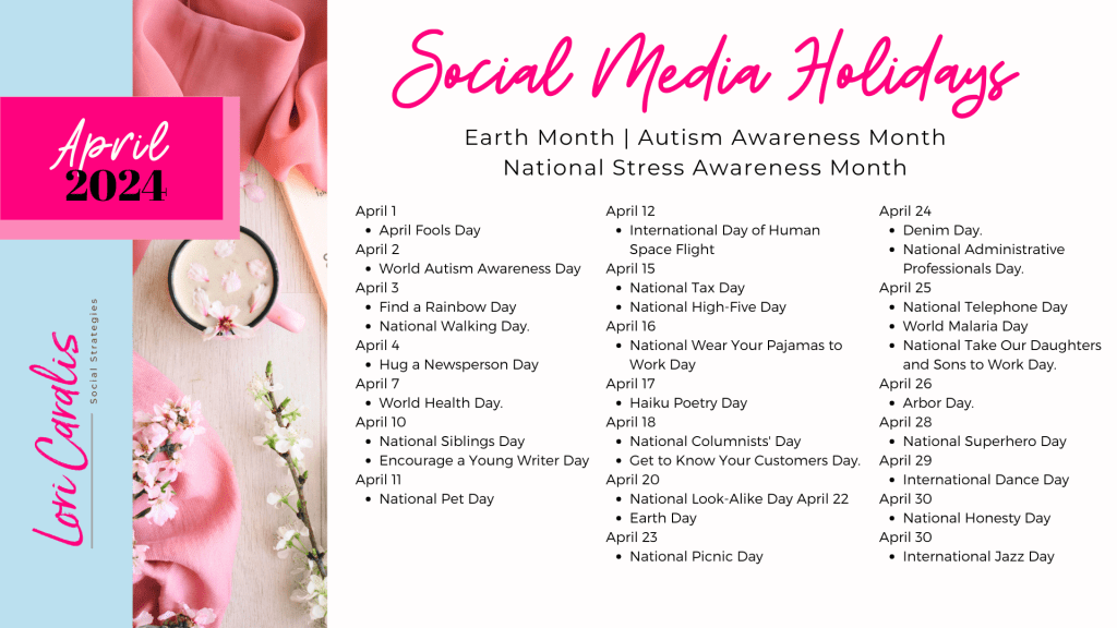 National Wear Your Pajamas to Work Day, National Pet Day, and National Sibling Day are always fun to create content around. There are also some important causes to recognize like World Autism Awareness Day and Earth Day.